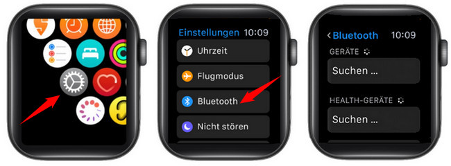 Schritt 3 Koppeln Sie Bluetooth-Kopfhörer oder Lautsprecher auf der Apple Watch. Versetzen Sie Bluetooth-Kopfhörer oder -Lautsprecher und Ihre Apple Watch in den Pairing-Modus, nehmen Sie dann Ihre Watch und gehen Sie zu Einstellungen > Bluetooth. Wenn Ihre Kopfhörer unter Geräte angezeigt werden, können Sie auf den Kopfhörer tippen, um sie zu koppeln.